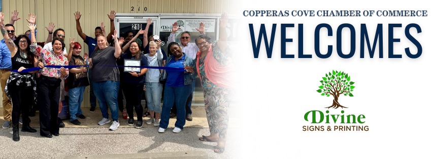 The Copperas Cove Chamber of Commerce proudly recognized Divine Signs & Printing as our Business of the Month with an official ribbon-cutting ceremony on April 17, 2025, at their location, 210 West Avenue East. Community members, city officials, and Chamber representatives gathered to celebrate this outstanding local business and its commitment to quality service and community involvement. Congratulations to Divine Signs & Printing for this well-deserved honor!